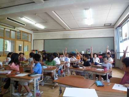 こんにちはタイムに,小数の計算に取り組みました。みんな真剣です。丸つけは,それぞれ手をあげて,発表します。
