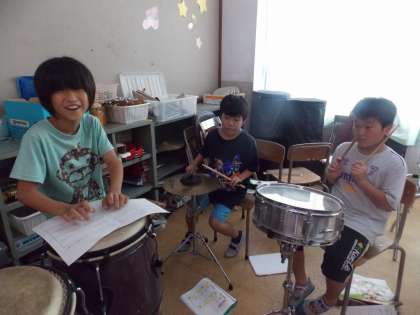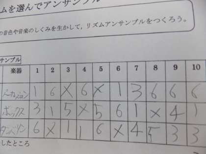 音楽の学習で、打楽器の良さを生かし、リズムアンサンブルを作っています。