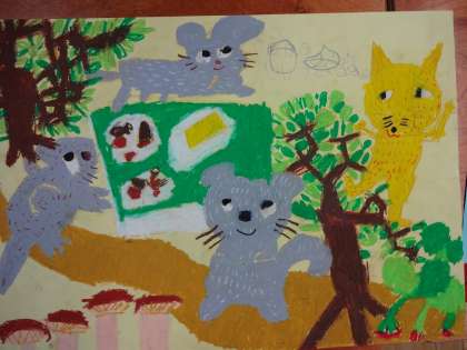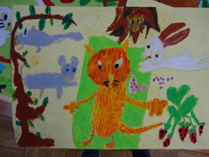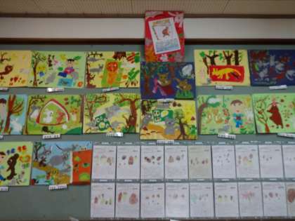 図画工作の学習で,お話を聞いて想像したことを絵に描きました。選んだ場面も,出てくる動物も描き方も様々…。