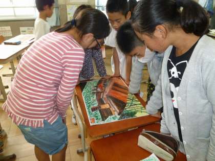 お話の絵が完成しました。今日はその鑑賞会をしました。友達の作品のすばらしいところや,まねしてみたいところなどをじっくり見ました。