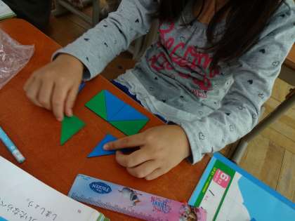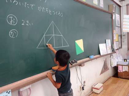 算数で,「かたちづくり」の学習に入りました。色板をつかっていろいろな形を楽しみながらつくることで,図形を構成する力を伸ばすことをねらいとしています。