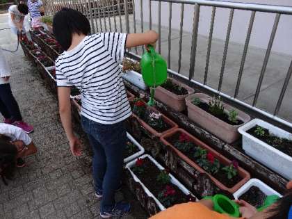 プランターを並べ終わると,水をあげます。