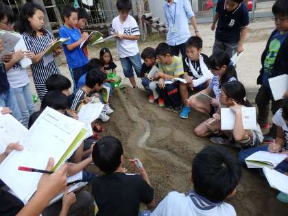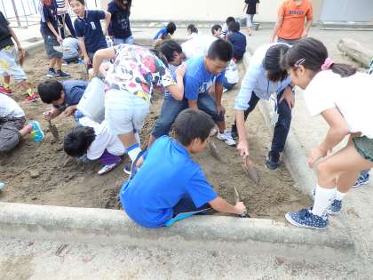 理科で「流れる水のはたらき」の実験をしています。全員で協力して山を作りました。水が少し止まると「いけいけ!!」や山の道が崩れると「あー!!」と声を上げながら実験を観察しています。