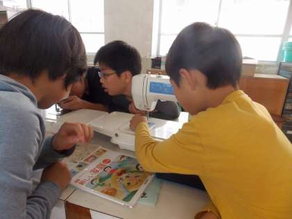 部品の名前を声に出して言いながら、班で協力して上糸をかけていました。