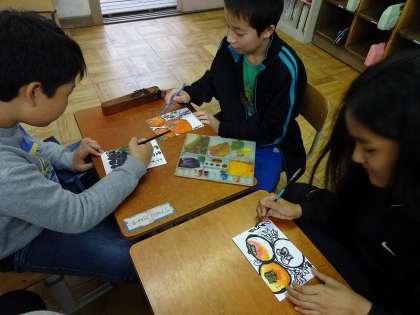 墨を使って描いた絵に,絵具で色をつけていきます。