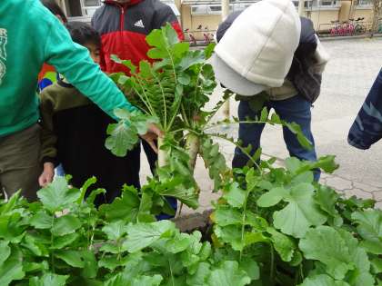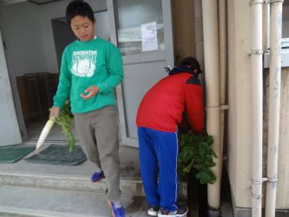 地域の方にいただいた大根の種をみんなで大事に育てて大きくなりました。今日,どれぐらい大きくなったかを調べるのに2本抜いてみました。大根の料理をインターネットで調べました。「大根もち・おでん・煮物・ステーキ」みんな楽しみにしています。明日,給食調理員さんに「おでん」をおいしく作るコツを教えていただきます!