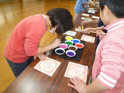 さぁいよいよ,事前に決めておいた絵柄に色をつけていきます。初めはドキドキしながらも,お手本を見ながら,丁寧に作業を進めています。
