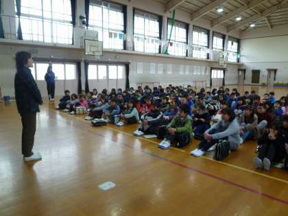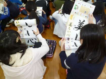 体育館で,4年生全員で書き初めをしました。まずは,全員で新年の挨拶をしました。次に,文字を書く時のポイントを聞き,みんなでお手本を見ながら確認しました。