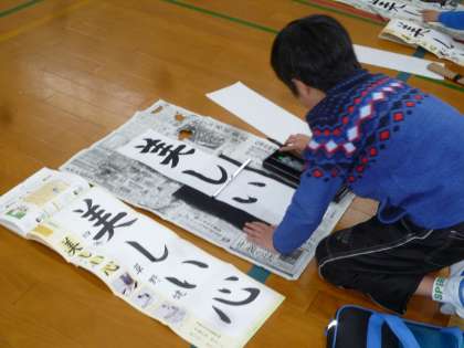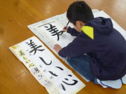 今年の文字は,「美しい心」です。はね・はらいや,文字を中心に書くことを気をつけながら集中して書いています。