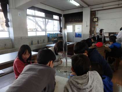 もののとけ方の実験で,水の中に入れた一粒の食塩がどうなるかを見ています。落とした一粒の様子を一生懸命目で追いかけています。