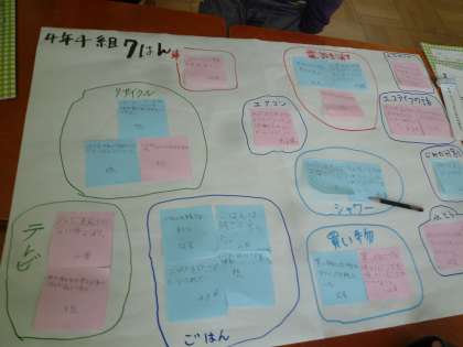グループで付箋にできたこと,できなかったことを書き,それを分類しました。エコライフの目標もたてて,それを達成するための方法や工夫を各グループが発表しました。