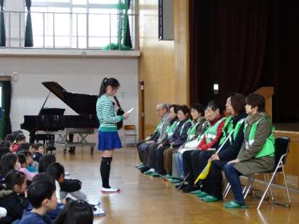 今朝は,校区の交差点などに立って子どもたちの登校の安全を見守っている方々を学校にお招きして,交通安全見守り感謝の集いが開かれました。