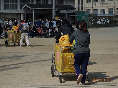 黄色い防空頭巾をかぶった園児たち。乳母車っていうのかな,台車のようなものに載せられて,キョロキョロしています。「どこに行くのだろう?」と思っているんでしょうね。