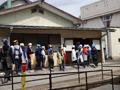 給食を取りに行くのは,4・5年生です。エプロンに三角巾をつけています。給食当番ではないので,給食のエプロンではありません。いつもと異なって新鮮な感じの給食室前です。