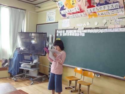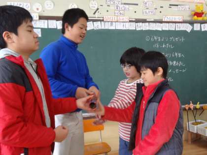 明日は,卒業式。6年生の二人から次のリーダーにバトンを渡してもらいました。「協力してさらにいいそらいろ学級にしてください!がんばってね!」と優しい言葉を添えてくれる6年生です。「リーダーをしてよかった!ダブルリーダーでよかった!」とリーダーが言うと「リーダーとしてまとめてくれてありがとう!」「楽しいけんかのないけじめのあるクラスにしていきます!」と次のリーダーは答えました。今まで見守ってくれてありがとう!と決意を表明してくれました。