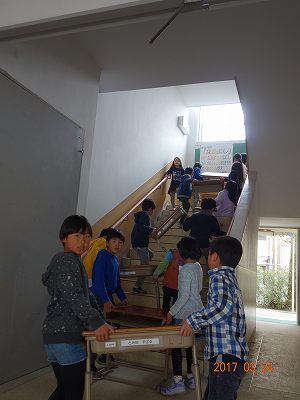 一列に並んで,机や椅子を運ぶ子どもたち。
