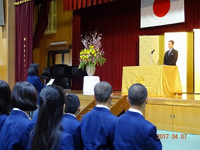 新入生からの入学の言葉は,本校出身の女子でした。後ろ姿しか取れなかったのが残念。来賓席に座っているものですから,こっそり撮影。
