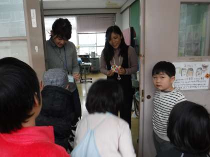 そらいろ学級では,朝,リーダーが先頭で健康観察を持って保健室にあいさつに行っています。今日は,1年生も一緒に行きました。その後,給食室にも行っています。今日は,特別に事務室にも行きました。