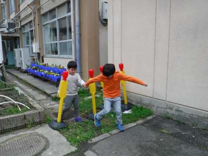 「なかなか芽が出ないな。」と心配していたじゃがいもの芽が昨日の雨で全部芽が出ていました。そら豆は花盛りです。卒業生と一緒に植えたじゃがいも・そら豆の収穫が楽しみです。校内を歩く時は,先輩が手をつないでくれます。
