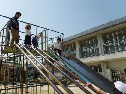 今日は,体育で遊具の使い方を学習しました。「足あげて棒をしっかりにぎってのぼるよ!」とお兄さん・お姉さんが教えてくれます。ここでおにごっこはしないことも確認しました。もちろん,すべり台の使い方や1年生は,先生と一緒の時だけ使えることを確認しました。