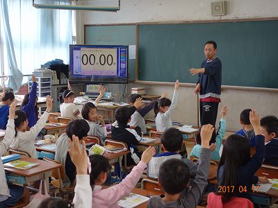 教室に入った瞬間は,みんな前を向いて先生の話を聞いていたのですが,突然Y先生の一言で,全員が挙手を。しかも,ピーンと真っ直ぐに手を伸ばして。スゴイ!