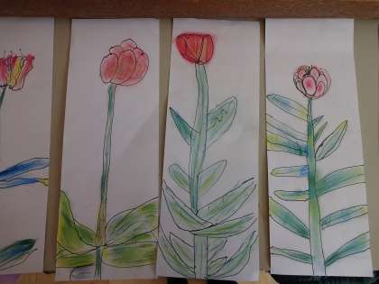 線がきしたチューリップの絵に,コンテで色をぬりました。最後に,発泡スチロールでつくったオリジナルのはんこを押して完成です!