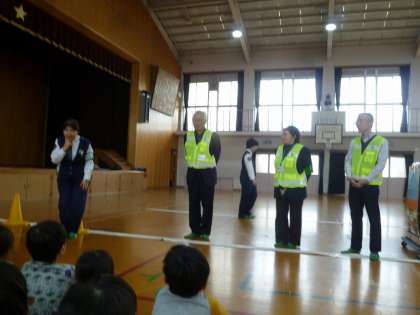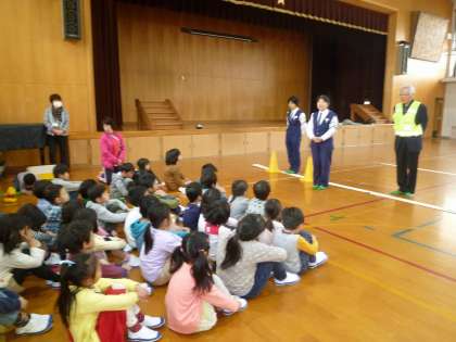 北警察署と地域の安全見守り隊の方から,交通安全についてお話をしていただいたり,どのように道を歩いたらよいのかを教えていただいたりしました。