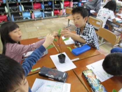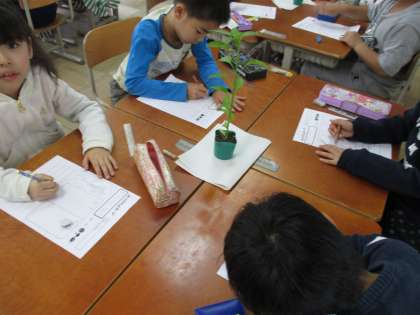 キュウリ,なす,ピーマンの苗を観察しました。自分の植木鉢にミニトマトを育てていますが,実は学年の花壇で他の夏野菜も育てます。葉をさわったり,においをかいだり,大きくなってほしいなと願いを込めて観察していました。