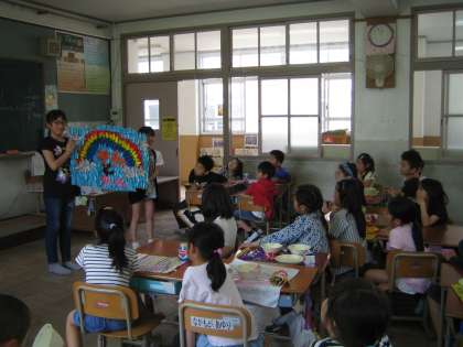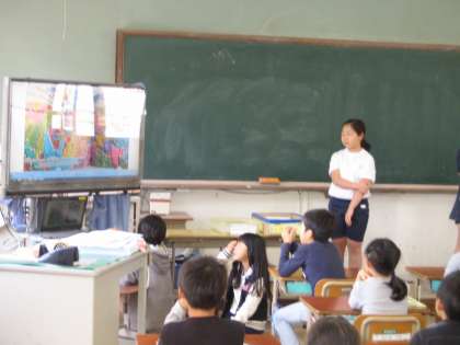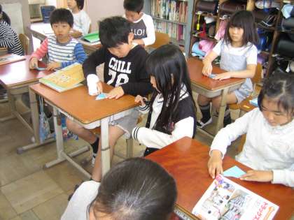 数日後,給食の時間に完成した作品を店に来てくれました。「わぁ,すごい」「こんなふうになるんやったんか」と驚きの声をあげていました。3年生の心も一緒に連れて行ってもらいます。