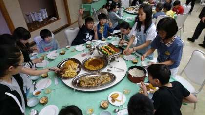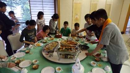 ごはんを分ける人,おかずを分ける人,もう食べ始めているテーブル。