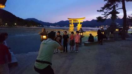 19:15 厳島神社・鳥居のライトアップを背景に記念撮影。