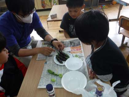 そら豆をホイルでまいて網で焼いたあと塩か醤油をつけて食べました。水分が多くふつふつと音がしました。「つるつるのお豆や!」「柔らかやね!」とつぶやいていました。 そら豆を見て絵も描きました。職員室に持って行くと教頭先生やN先生・M先生・I先生・Y先生が「美味しい!味が濃いね!」「こんな食べかたが あるんやね!」と言ってもらいました。「水分が多くてジュージューして後こげたけどおいしかった!」とそら豆のアピールをしました。