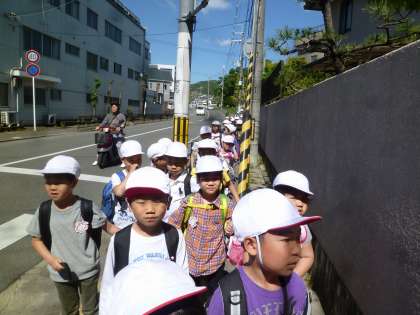1年生になって初めての校外学習。お天気もよく,これから頑張って植物園まで歩きます!!
