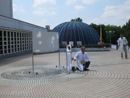 写真は太陽の光を集めると温度が上がるのかの実験をしています。