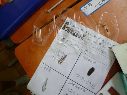ホウセンカ,ヒマワリ,コスモス,ふうせんかずらのたねを観察しました。形や色,大きさなどがそれぞれ違っていました。みんなで小さいたねをじっくり観察しました。