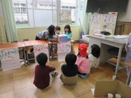 生活科で作った秋の自然を作ったおもちゃを使って、保育園の園児たちに楽しんでもらう会を開きました。