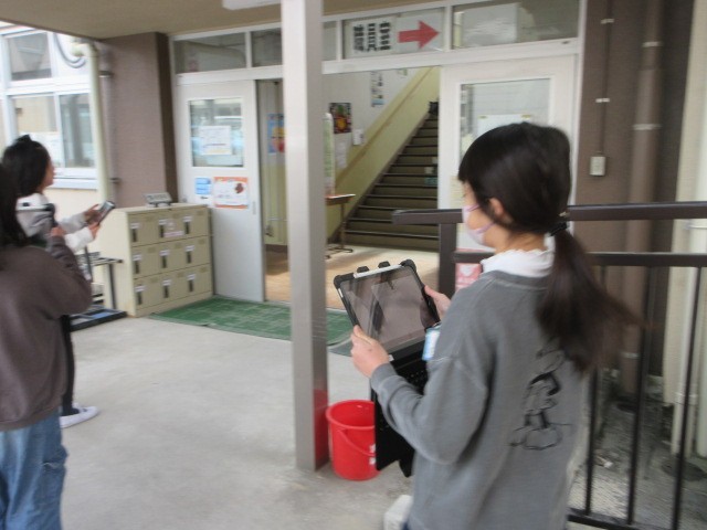 道案内を英語で行います。I padで自分の気に入った場所へ実際に歩いて行き、「go straight」など、英語で道案内をしながら撮影をしていました。出来上がった動画は、いったん先生に提出します。