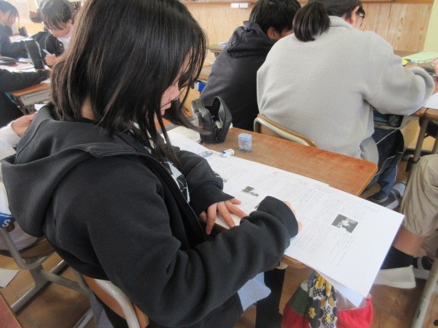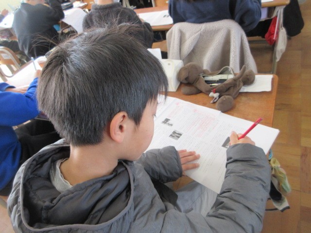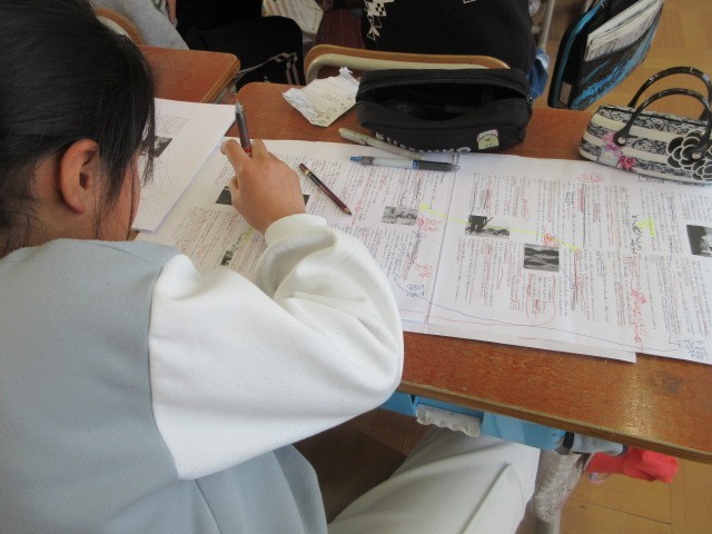 一人一人が自分の「問い」に対し、登場人物の行動や情景を表す表現などから、登場人物の心情を考え、問いの答えを見つけようとしました。考えをどんどんと書きこむ姿が見られました。