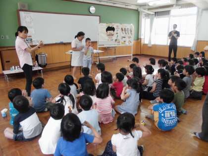 1年生が歯科衛生士の先生から,どうしてむし歯になるのか,どうしたら健康な歯でいられるのかなど分かりやすく教えていただき,正しい歯のみがき方を教えていただきました。