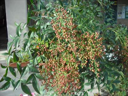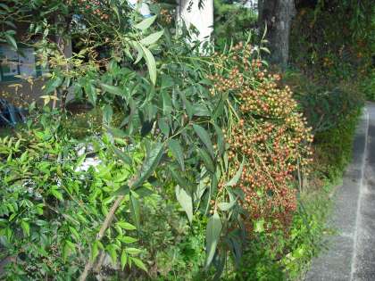 南天の実が今年もたわわに実っています。少し色づいてきています。