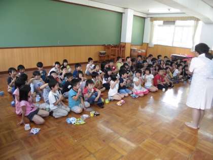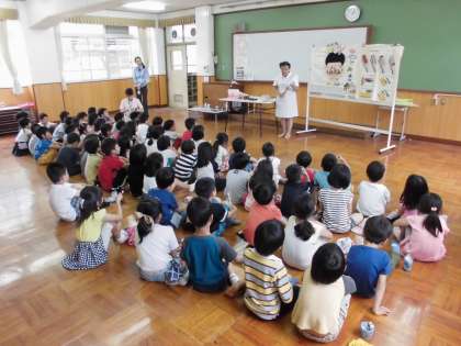 歯科衛生士の先生から,1年生の子どもたちは,最初に,歯が汚れてくる理由や歯の大切さなどを教えていただきました。