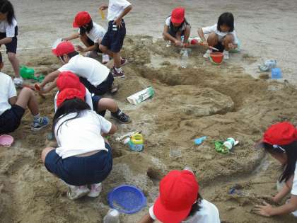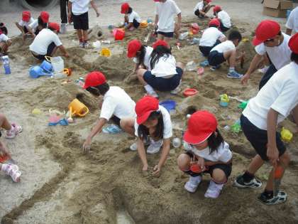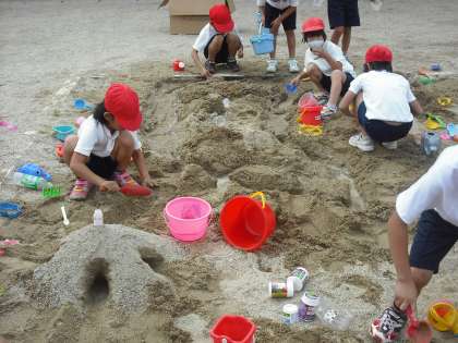 今日は楽しみにしていた造形あそびです。砂場で自分たちの考えたものを作っていきます。子どもたちは造形あそびが大好きです。いつの間にかほかのグループと合体して作っている形もつながっていきます。