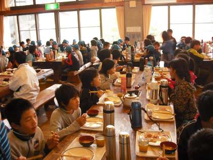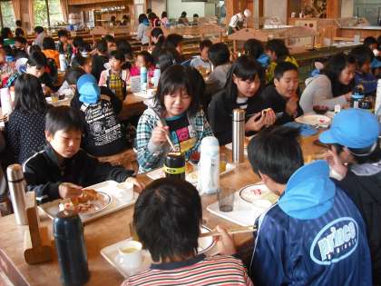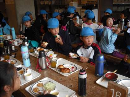 みんな朝から食欲旺盛です。パン食の子が多くいましたが,中にはパンとごはんと両方を食べている子もいました。この分なら今日の活動(花背交流の森オリエンテーリング)も心配なさそうです。