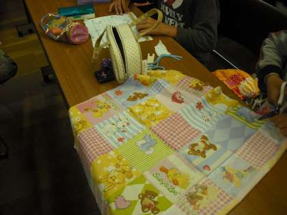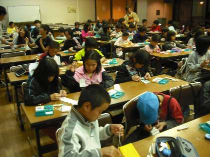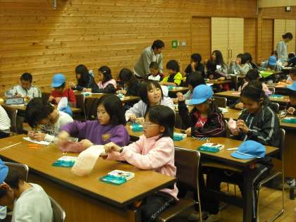 昨日作ったおはしを入れる袋を作ります。でも,今日のオリエンテーリングでちょっと疲れているのか眠そうな子もいて,なかなか手が進みません。仕上げは学校に帰ってからすることになりました。同時に予定していた星の観察は曇り空のためできませんでした。
