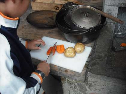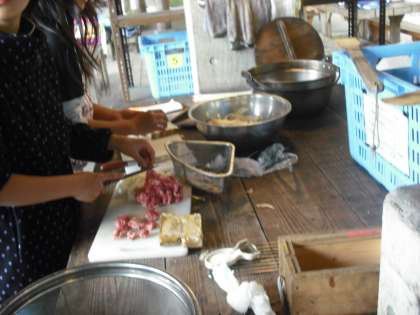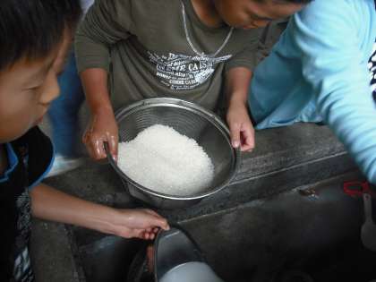 道具や材料をを洗って,早速取り掛かります。お米を研いだり,野菜を切ったりとみんなでワーワーキャーキャー言いながら,楽しく準備を進めています。