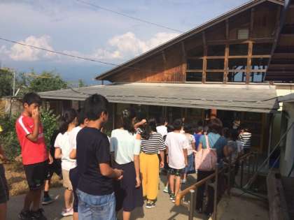 長野県飯田市にある三和観光農園に到着しました。もぎたてのりんごをパイ生地に自分で包み,アップルパイ作り体験を楽しんでいます!