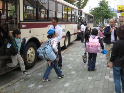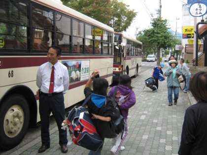 予定の時刻より少し早く学校へ到着しました。さすがに疲れたのか,眠そうな顔が多かったです。