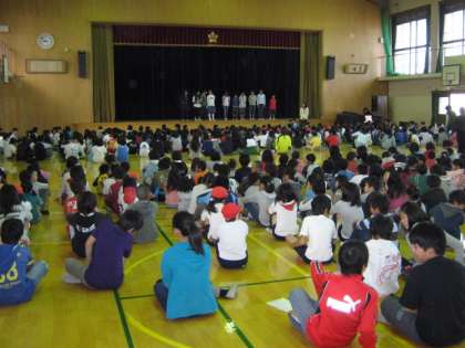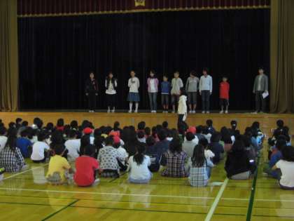 今月の児童集会は,前期のがんばり目標「しっかりあいさつ 守ろうチャイム」ができていたかどうかを振り返り,代表委員会で話し合った後期のがんばり目標「意識してチャイムがなったら やることやろう」が発表されました。けじめをつけて学校生活がおくれるようにがんばろう。
