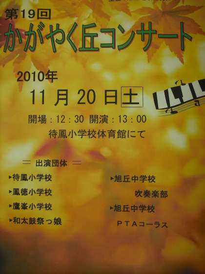 「旭丘地域生徒指導連絡協議会主催の「第19回 かがやく丘コンサート」が11月20日(土)午後1時より,待鳳小学校 体育館で行われます。