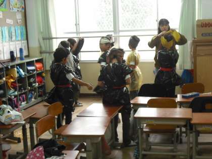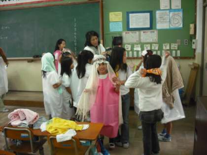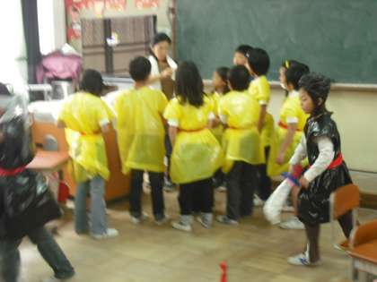 学習発表会に向けて衣装合わせをしています。カラー袋で作った服やお家から持ってきたもので衣装を作っています。だんだん役になりきってきたようです。